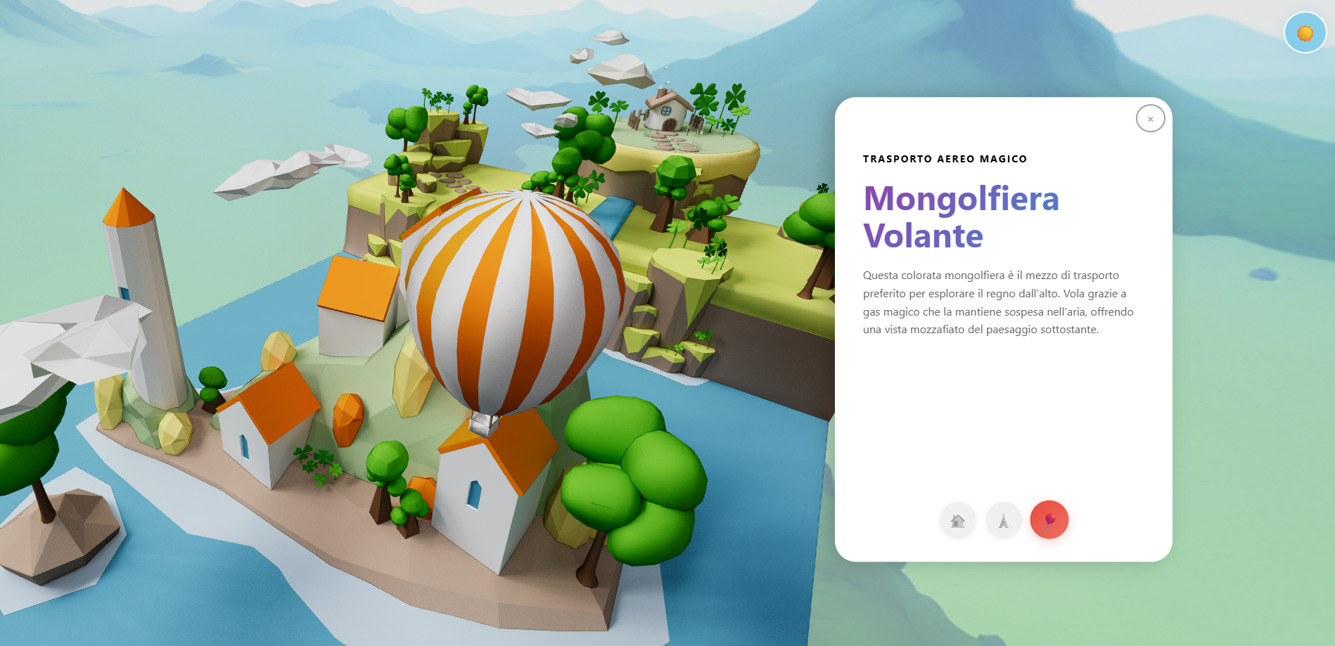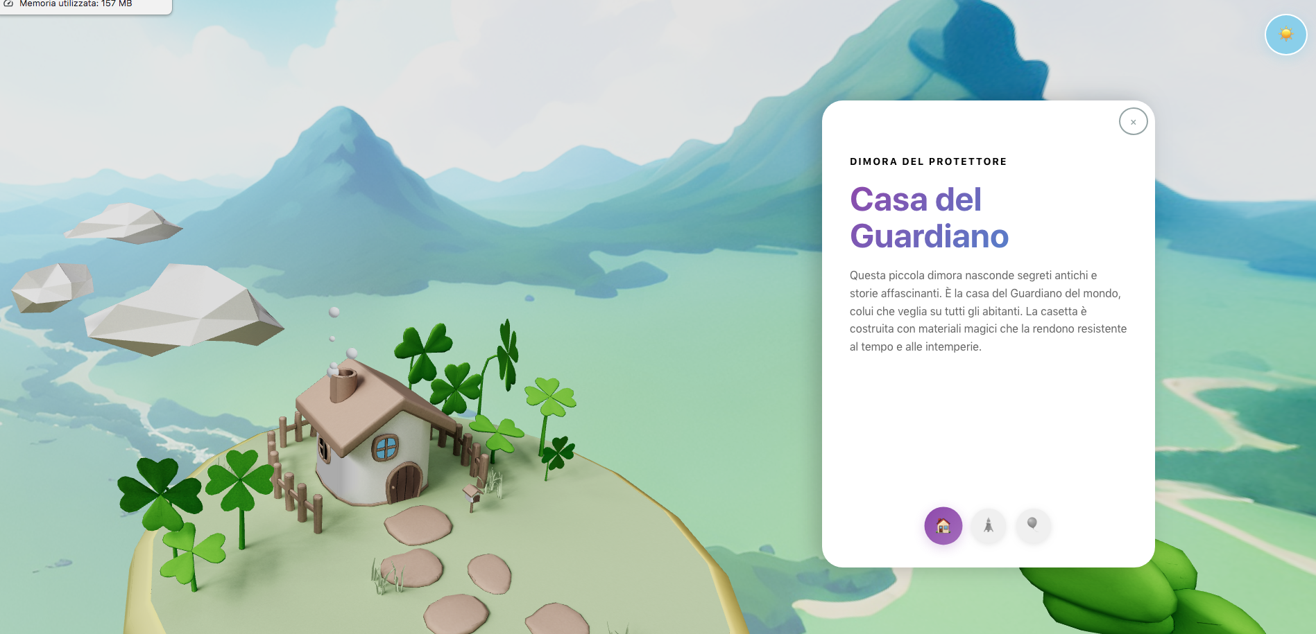 Demo sviluppata in fase di ricerca interna per testare l’interazione tra elementi 3D, movimenti di camera dinamici ed elementi in HTML che mostrano diversi contenuti, come card, popup o intere pagine.